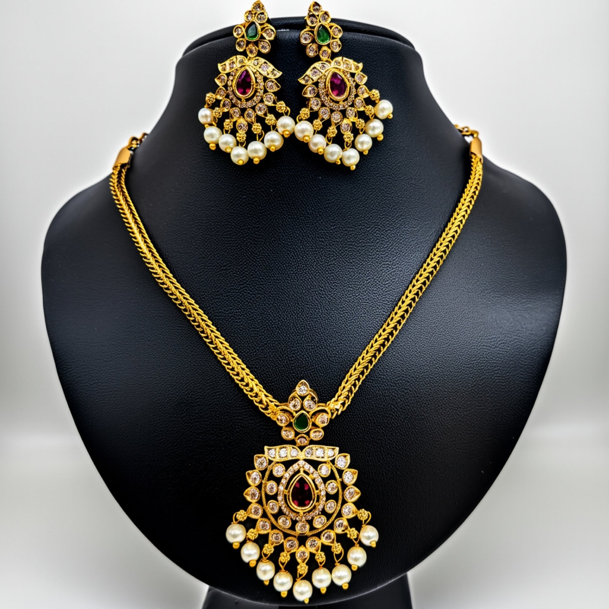 The Chandrika Pearl Mandala Set features sparkling stones, a rich ruby centerpiece, and classic pearl drops — perfect for your festive glow. 🌸
