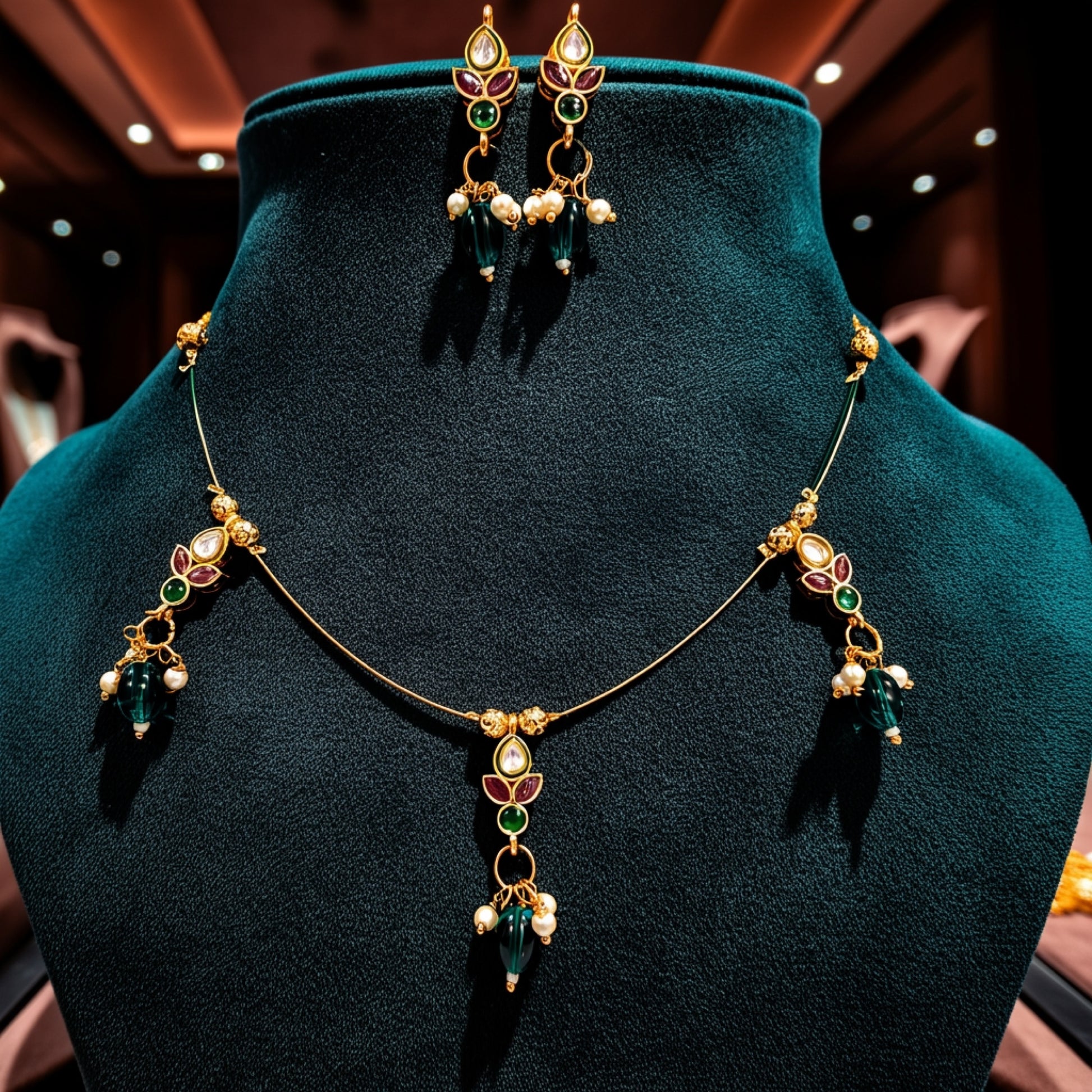 - Design: Lotus motif with green, pink stones, pearls & green drops