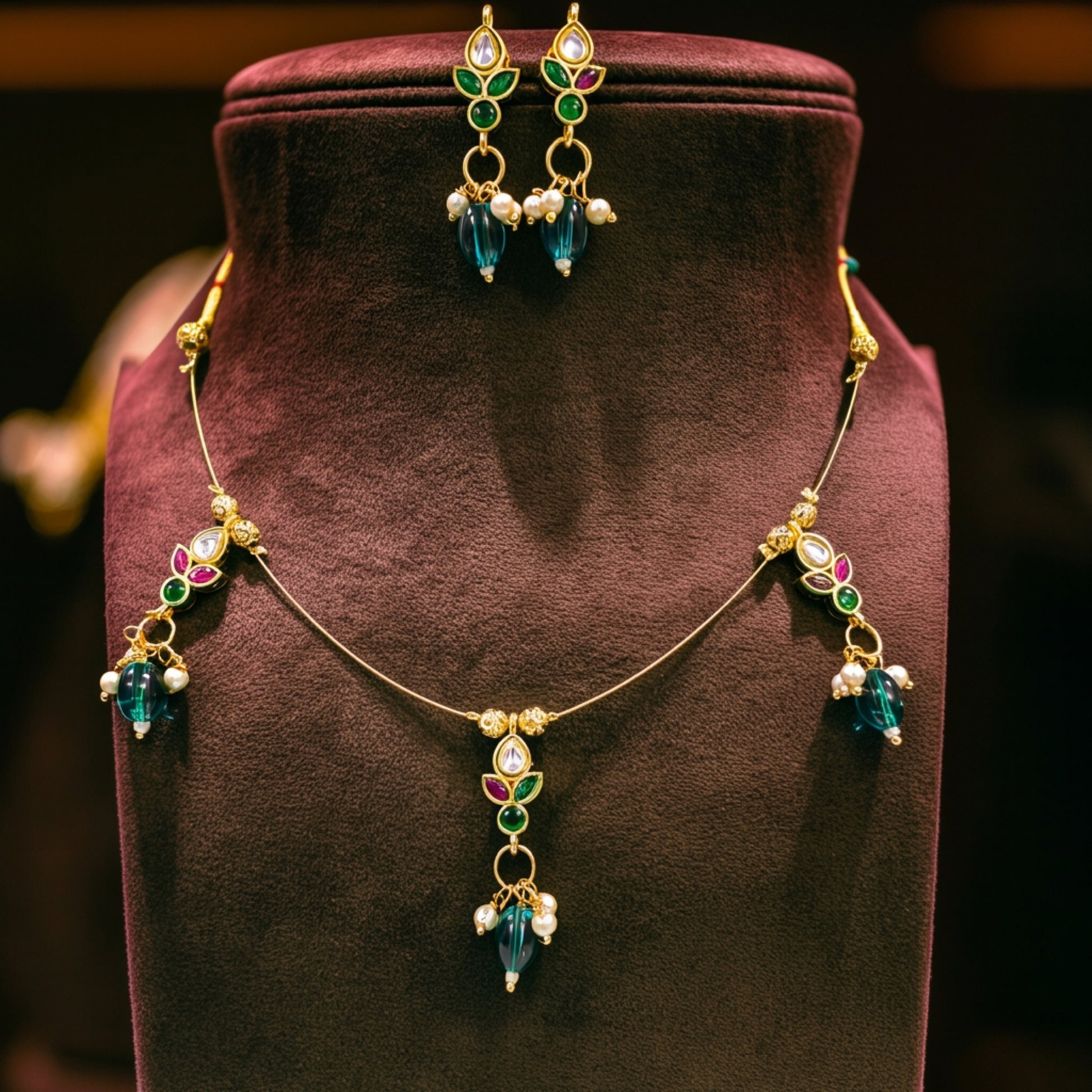 Graceful and modern with a touch of tradition, this Lotus Bloom necklace set features a sleek invisible thread design, paired with matching earrings. Adorned with green & pink floral stones, pearl clusters, and emerald-toned drops, this set is both vibrant and delicate.